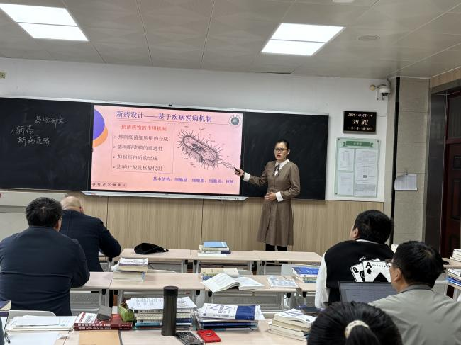 在课堂展示环节,两位优秀教师依次登台,呈现了高质量的教学示范。校级优秀教师张翠红副教授以《药学导论》课程中的《药物研发》章节为内容开展说课。她以清晰的逻辑梳理药物研发全流程,结合当前医药行业发展趋势明确教学目标,巧妙运用案例教学法实现理论知识与行业实践的深度衔接,同时将思政元素有机融入教学过程,有效激发学生的爱国情怀与科研责任感,充分展现了扎实的教学功底与丰富的教学经验。