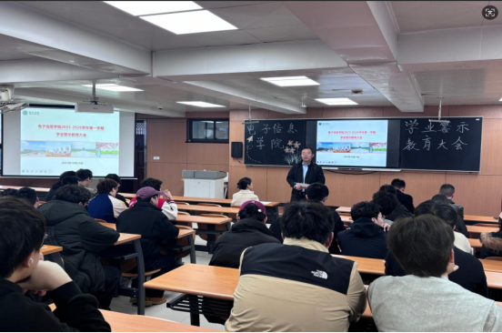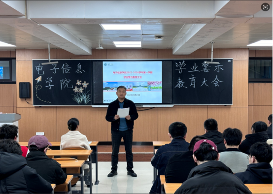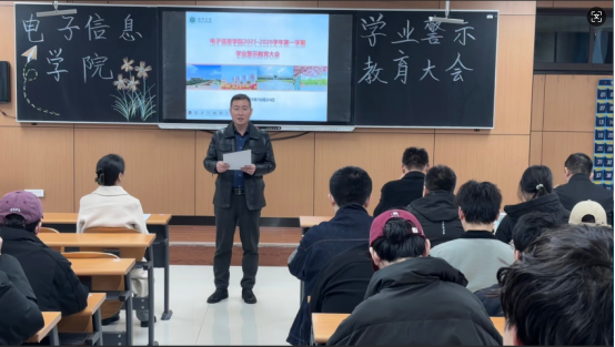 为进一步健全本科生学业帮扶长效机制,切实督促学生端正学习态度、顺利完成学业,根据学校教务处《关于开展2025-2026学年第一学期本科生学业警示工作的通知》要求,电子信息学院于2025年10月24日16:20,在2号教学楼2222教室召开学业警示教育大会。学院党委书记、学生工作副院长曾皈栋、教学副院长辛督强、学生工作办公室主任段领、各相关班级班主任、辅导员及全体被警示学生共同参会。