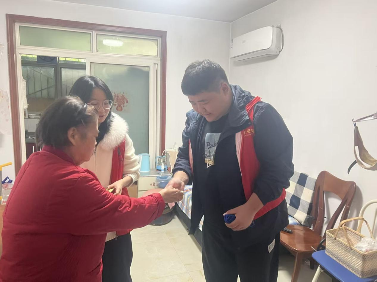 西京学院电子信息学院十余名学生党员在四名老师的带领下早早来到社区,他们身穿青年志愿红马甲敲开老人家门,围坐身旁耐心倾听往事,从家长里短到人生智慧,从健康养生到趣味见闻,屋内满是欢声笑语。学生小李感慨,奶奶紧握他的手说“你们像孙辈般亲”,这让他真切领悟 “老吾老以及人之老” 的深意。