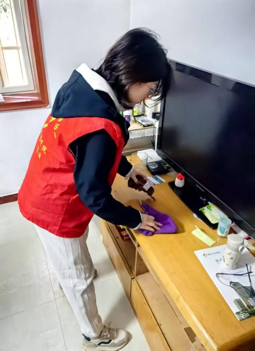 在独居老人家中,师生党员们迅速分工、默契协作。有人手持扫帚清扫角落积尘,有人蘸取温水细致擦拭家具与窗台,有人按类别整理散落杂物并归置整齐。一番忙碌后,老人们的居住环境变得干净整洁、焕然一新。