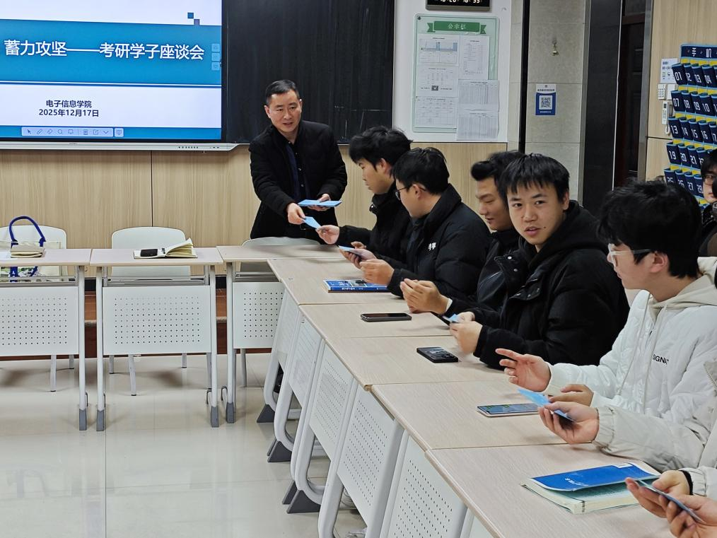 为切实关心关爱2026届考研学子的备考状况,传递学院的深厚关怀与热切期望,12月17日下午,电子信息学院学工办主任段领、学科建设办公室主任邓勤利在 2022 教室开展了考研慰问座谈会。此次活动以考前动员与专项慰问紧密结合,为即将踏上考研征程的莘莘学子加油鼓劲、赋能助力,充分传递学院的深厚关怀与热切期望。