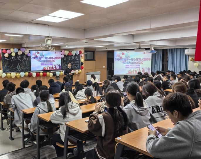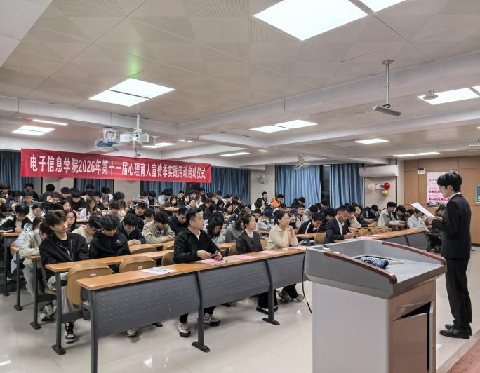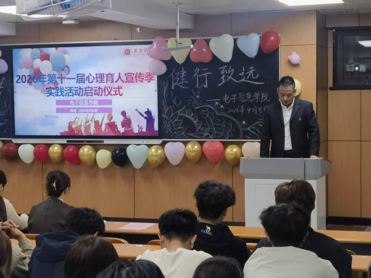 为贯彻落实教育部“健康第一”教育理念,全面落实学校第十一届“阳光护航”心理育人宣传季实践活动工作要求,深化四级心理育人网络体系建设,培育大学生自尊自信、理性平和、阳光向上的积极心理品质,2026年4月8日,西京学院电子信息学院在2229教室举行第十一届心理育人宣传季实践活动启动仪式。学院党委书记曾皈栋、学生工作办公室主任段领、大学生心理健康教育与咨询中心教师赵素素、学院辅导员及140名心理委员代表参加仪式,仪式由学院二级心理辅导站李鹏老师主持。