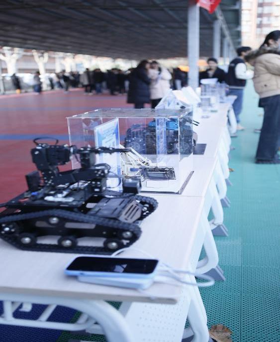 与赛场的热血氛围交相辉映,篮球场旁的科技成果展区同样人气高涨。多个门型展架整齐陈列,集中展示了电子信息学院研究生在读期间完成的科研项目、学科竞赛获奖作品、专利成果及学术论文等优秀成果。