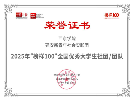 近日,由中国大学生知行促进计划、青年影响力创新中心联合主办的2025年“榜样100”全国优秀大学生社团及团队榜单第二批名单正式揭晓。本次评选聚焦乡村振兴、文化传承、志愿服务等八大核心领域,吸引全国376所高校的1320支优秀团队同台竞技,经过严格评审,西京学院电子信息学院“延安新青年”社会实践团凭借鲜明的红色特色与扎实的实践成效脱颖而出,成功登榜,为学校赢得殊荣。